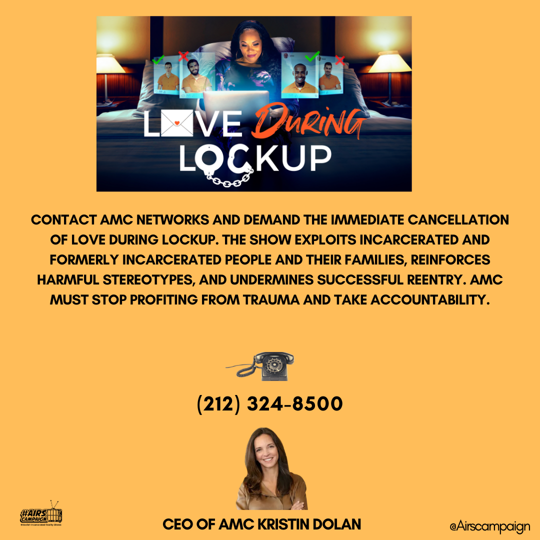 “Hello, my name is [Your Name], and I’m calling from [Your City, District, or Community]. I strongly urge AMC and its leadership to cancel the show Love During Lockup.This program is exploitative and perpetuates damaging stereotypes about incarcerated and formerly incarcerated individuals and their families. It reinforces stigma that makes reintegration into society more difficult while profiting from their struggles. Love During Lockup undermines efforts for meaningful criminal justice reform and fuels harmful perceptions of incarceration.