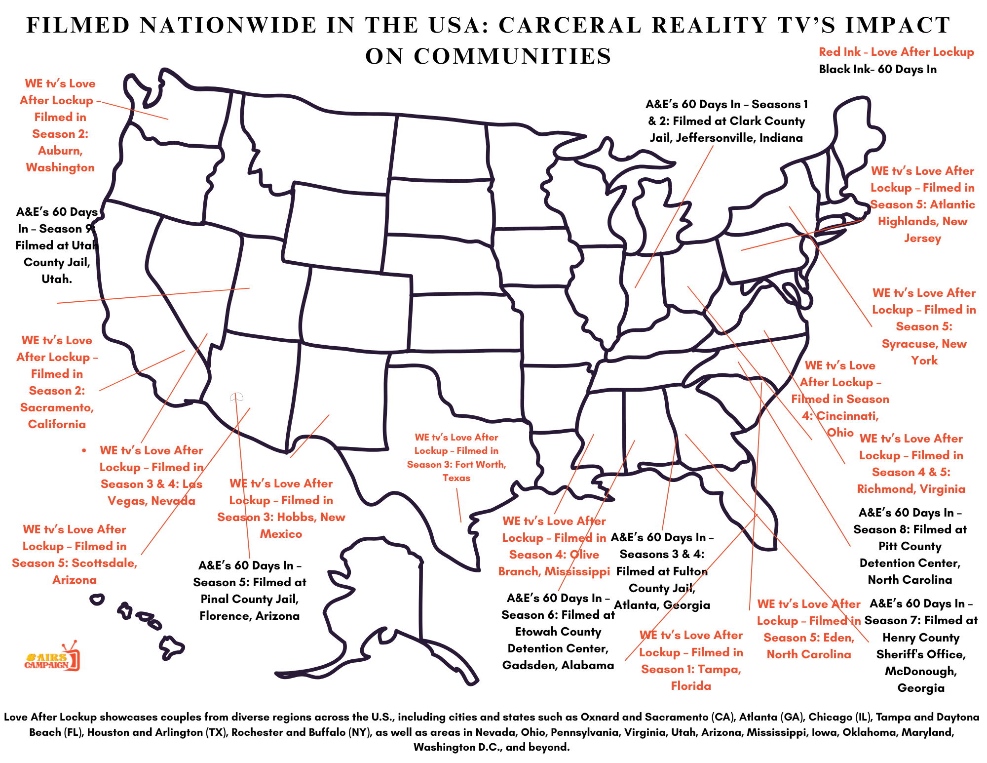 (As shown in the map below, Carceral Reality TV shows are being filmed in jails, prisons, and communities across multiple states, highlighting the widespread reach of this exploitative media industry.)